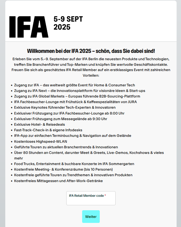 Der auf der Startseite gewünschte IFA Retail Member Code ist Ihre ElectronicPartner Mitgliedsnummer. Bitte geben Sie diese im 10-stelligen Format mit 000 am Anfang ein!